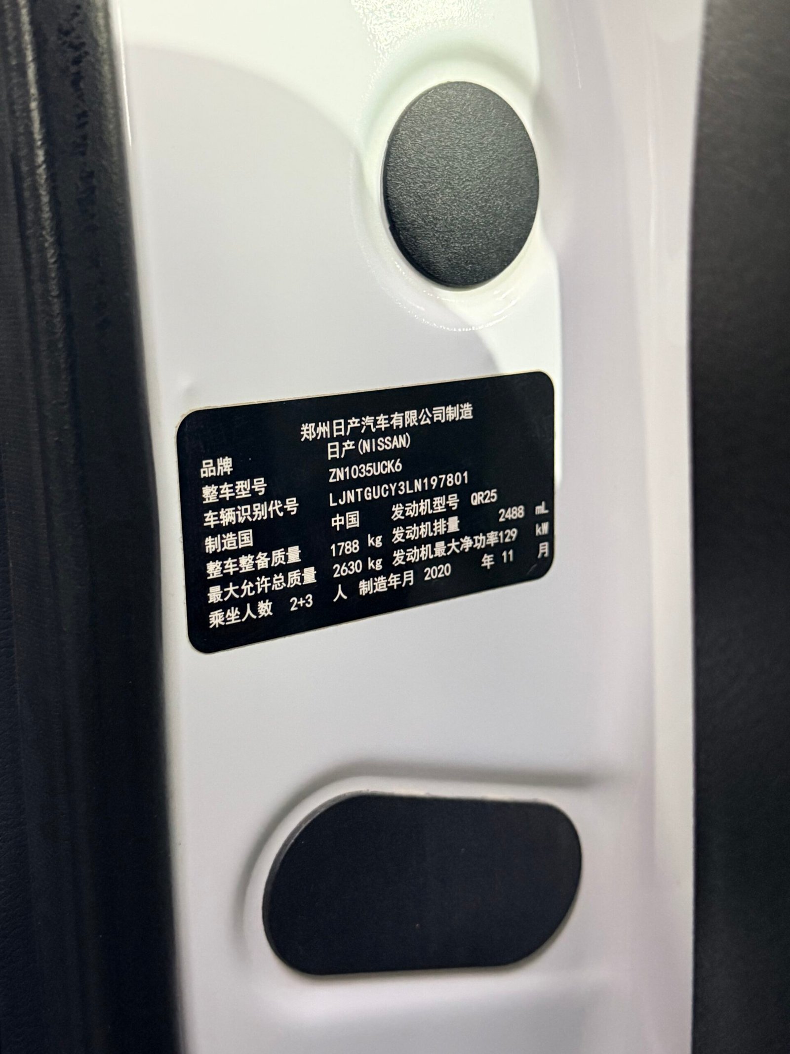 It is manufactured by Zhengzhou Nissan Automobile Co., Ltd. and is of the Nissan (NISSAN) brand. The engine displacement is 2488 mL, with a maximum net engine power of 129 kW. It is made in China, with a kerb mass of 1788 kg and a maximum allowable total mass of 2630 kg. It was manufactured in November 2020 and can accommodate 5 passengers.